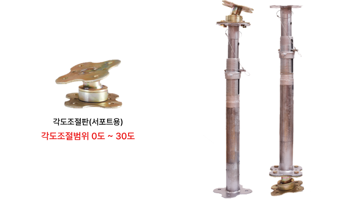 본 제품은 잭 서포트(Jack Support) 사용 시, 작업 면의 미세한 경사 및 틀어짐에도 자동으로 수직 하중을 정렬하여 전달하는 360° 전방향 조정 기능을 갖춘 각도 조절용 플레이트입니다. 최대 21°까지 경사 조정이 가능하며, 다양한 지면 조건에서 안정적인 하중 지지 및 충격 흡수를 실현합니다.